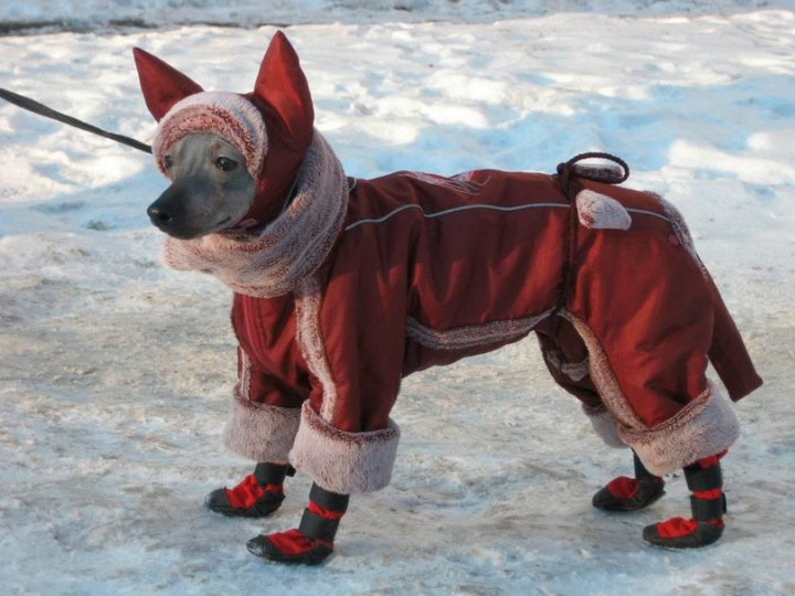 Le Terrier Américain Nu est un excellent choix pour ceux qui souhaitent se divertir autrement qu'avec des poupées. Il est généralement peu sensible au froid et supporte souvent mieux les basses températures que les autres races à poil lisse grâce à son niveau d'activité. Cependant, pour prévenir l'hypothermie ou les engelures sur les zones sensibles (oreilles, queue, pattes), il est courant d'habiller les chiens. En été, ils portent des t-shirts pour les protéger des rayons ultraviolets. À l'approche de l'hiver, il convient d'adapter leurs vêtements aux conditions climatiques. Par temps froid, ils portent un chapeau et des chaussures, et il est parfois conseillé de leur coudre une protection pour la queue ou d'acheter des vêtements spécifiques. rochers nus, dans les modèles desquels tout est fourni.