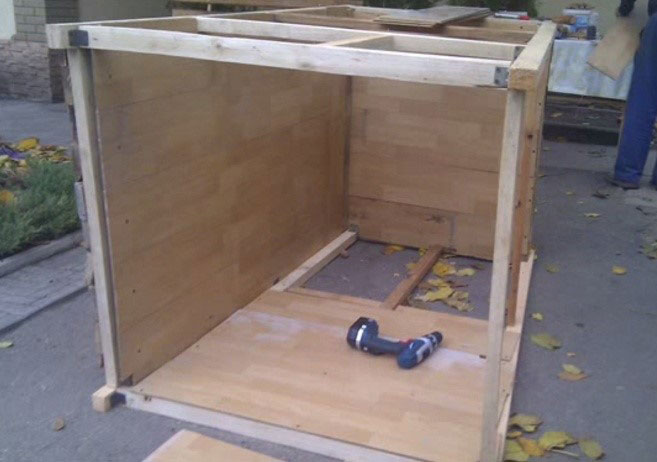 Si vous construisez une niche pour un grand chien, vous pouvez renforcer la structure avec des traverses supplémentaires en bois. Recouvrez ensuite une face de la structure.