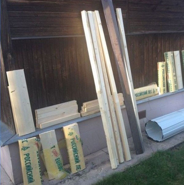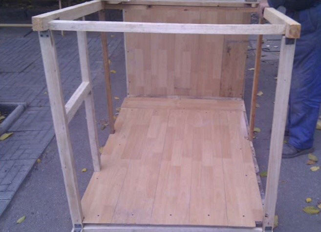 La troisième étape consiste à assembler le cadre. Prenez une poutre de 100 x 100 mm et découpez-en quatre morceaux. Deux auront la même hauteur que la niche, et les deux autres seront plus longs de 10 cm. Clouez ces morceaux aux coins de la base. Les morceaux les plus longs seront placés à l'avant, et les plus courts à l'arrière.