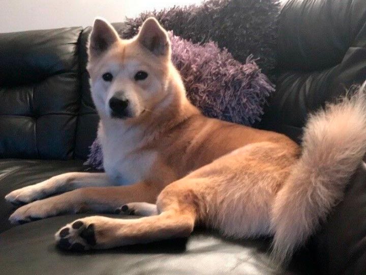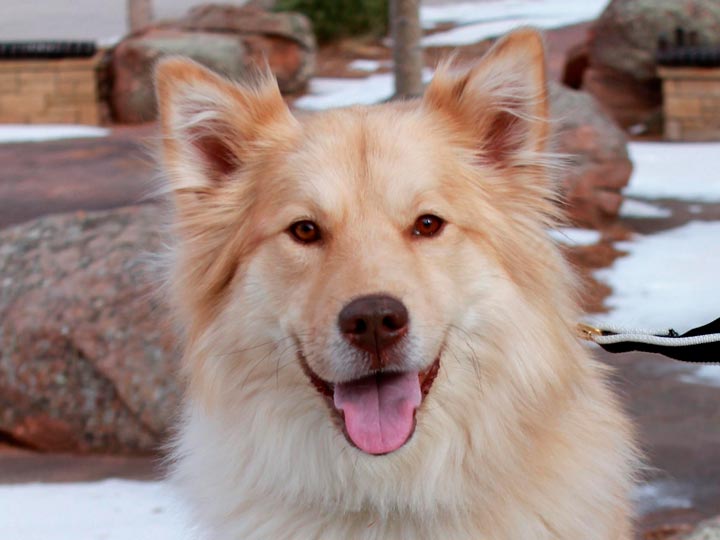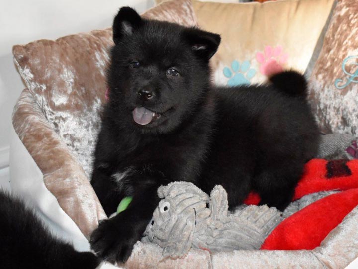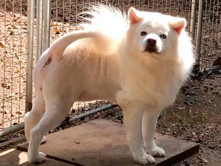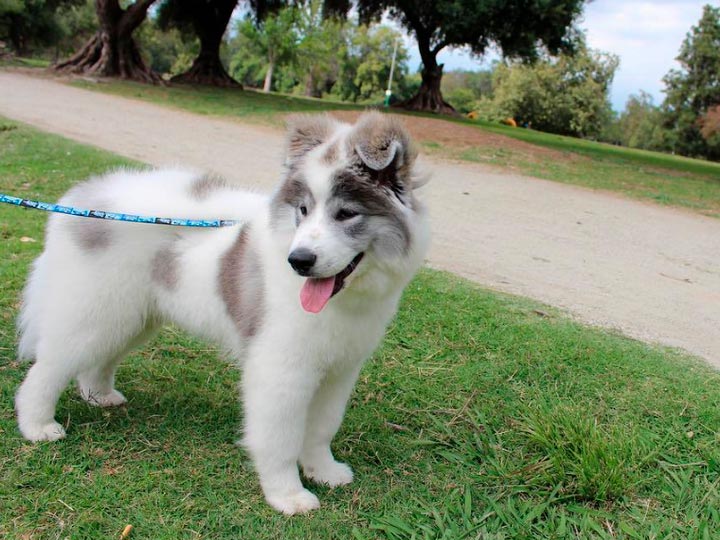 Le museau est généralement allongé, en forme de coin et assez large, avec un nez proéminent et des yeux ouverts de couleur variable (l'hétérochromie est fréquente). La langue, comme celle du Chow-Chow, peut être foncée ou tachetée de foncé. Les oreilles sont dressées et de taille moyenne. Le corps est robuste et modérément allongé. Les membres sont forts et puissants. La queue, magnifiquement fournie, est portée basse ou enroulée sur le dos.