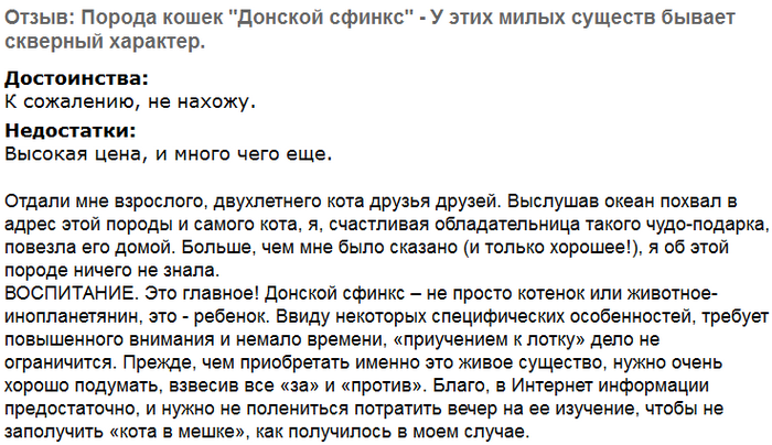 Les avis des propriétaires ne remplacent évidemment pas le contact direct, mais ils peuvent vous aider à mieux connaître la race et à vous faire une idée générale. Les Don Sphynx sont des chats paisibles et totalement non agressifs qui tissent des liens forts avec leurs maîtres, tout en restant indépendants et en les traitant d'égal à égal.