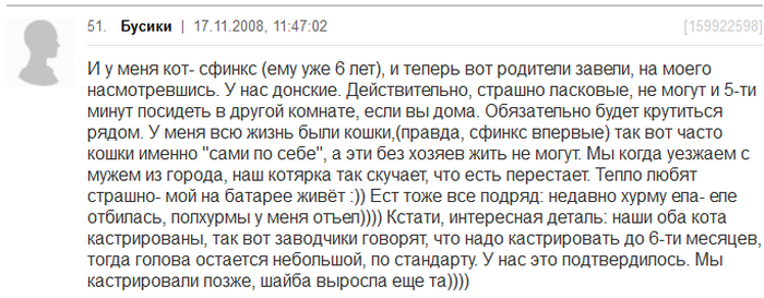 Il y a trois ans, je suis allée rendre visite à des proches qui avaient deux chats. L'un était un Sphynx à poil court, l'autre un Dontchak. J'étais assise sur le canapé à regarder la télé quand soudain, le Sphynx a sauté sur le canapé, s'est blotti contre moi et s'est installé confortablement pour dormir. Tout le monde était stupéfait. Personne ne s'y attendait ; après tout, il ne m'avait jamais vue auparavant. Mais son ronronnement et sa chaleur m'ont comblée. Bref, Bim a fait le voyage de Bachkirie au Tatarstan sans encombre, assis sur mes genoux tout le long, est arrivé à la maison avec une assurance de chef, et se comporte comme tel.