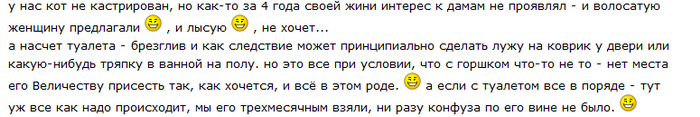 Il adore manger avec nous. Il est ravi quand tout le monde est à la maison, qu'on lui parle et qu'on joue avec lui. Le nôtre s'assoit même sur le bord de la baignoire et nous regarde prendre notre bain. Si on le laisse seul trop longtemps, surtout la nuit, il grommelle pendant deux heures, fait la tête et ce n'est qu'après une friandise que Sa Majesté se met à ronronner et à réclamer des câlins. Si tout le monde regarde la télé et qu'on ne le remarque pas, il grimpe sur la table de chevet et s'installe de façon à ce que l'écran soit invisible. Il reste assis là à attendre qu'on le prenne dans les bras, c'est-à-dire que quelqu'un s'occupe de lui. C'est lui qui décide qui dort avec lui. Les radiateurs de l'appartement lui appartiennent, tout comme les rebords de fenêtre. Avant son arrivée, il y avait des fleurs, mais elles l'empêchent de prendre le soleil, et il les a progressivement fait tomber des rebords (il en a mangé certaines et en a jeté d'autres). Parfois, je me dis que ces animaux sont plus intelligents que la plupart des gens.