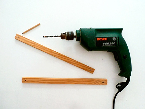 Percez des trous légèrement en retrait par rapport aux bords des planches, dans lesquels passeront les cordes du hamac. Il est important de veiller à la symétrie, sinon le hamac sera bancal.