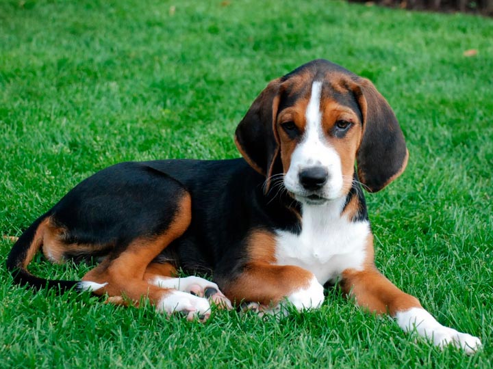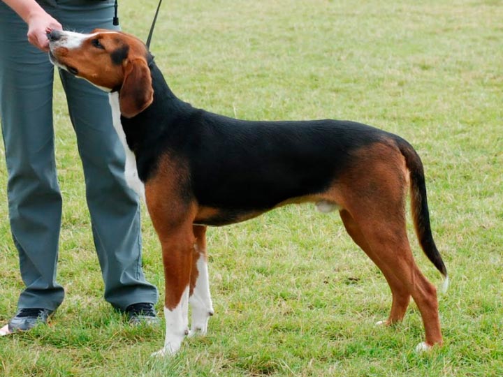 Le poil est mi-long, rêche et bien couché. Il est plus court et plus lisse sur les oreilles, la tête et le devant des pattes. Il est plus long à l'arrière des cuisses et sous la queue. La robe est tricolore. Le haut du cou, le dos, les flancs et le haut de la queue sont noirs. Le poil de la tête, des oreilles et des pattes est brun rougeâtre. Le haut du museau, le devant du cou, la poitrine, le bout de la queue, le bas des pattes et les coussinets doivent être blancs.