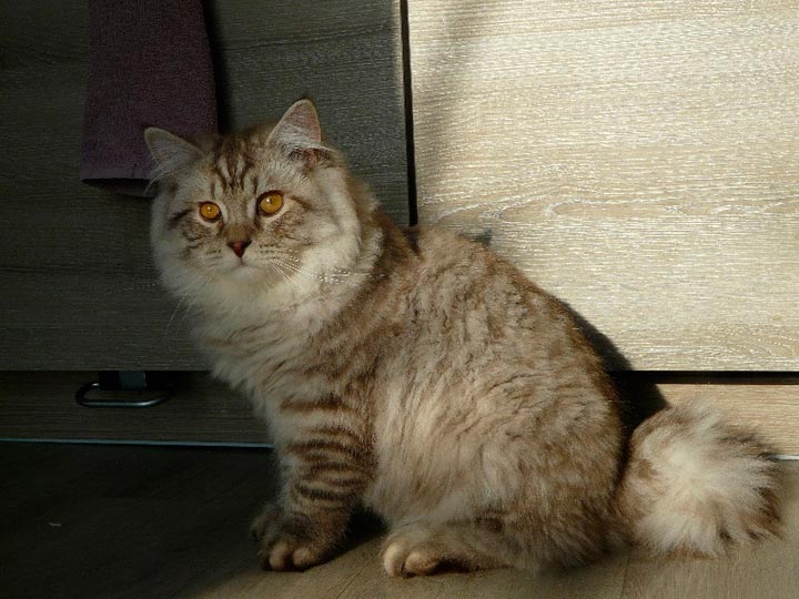 Plus tard, ils commencèrent à s'allier aux Écossais. britannique, les Perses et exotiquesL'objectif principal est de développer de nouvelles couleurs, mais parallèlement, le nombre de chats porteurs du gène récessif du poil long ou nés avec un pelage duveteux a considérablement augmenté. Certains éleveurs sélectionnent délibérément des animaux à poil long pour obtenir des chatons présentant les mêmes caractéristiques.