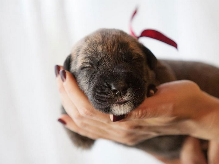 Il arrive que les chiots nouveau-nés aient une petite tache blanche sur le museau, qui disparaît généralement vers l'âge de 2 mois.