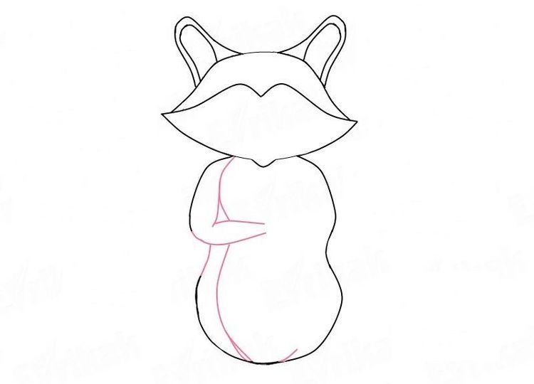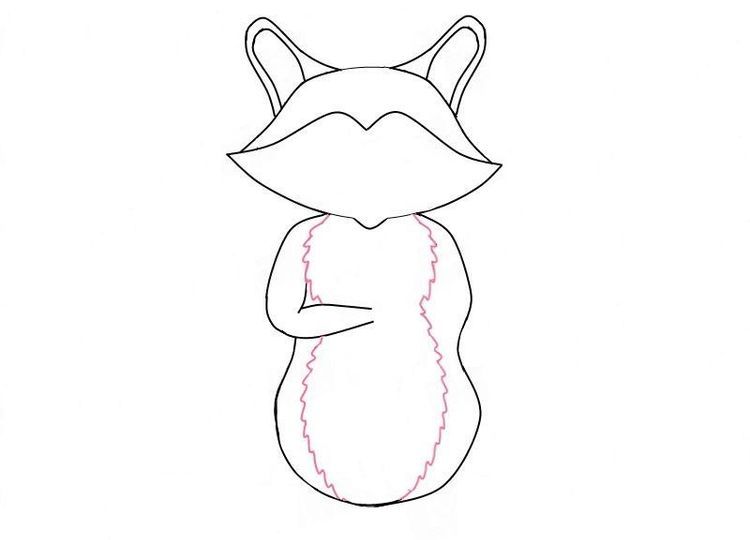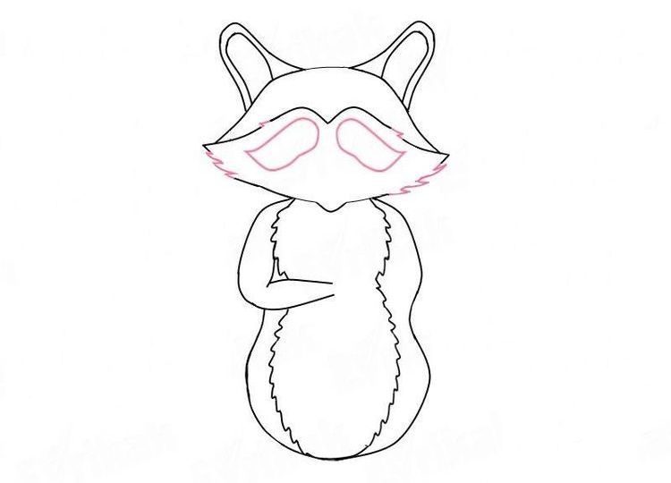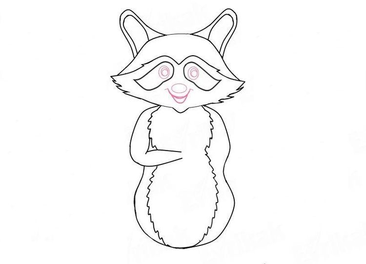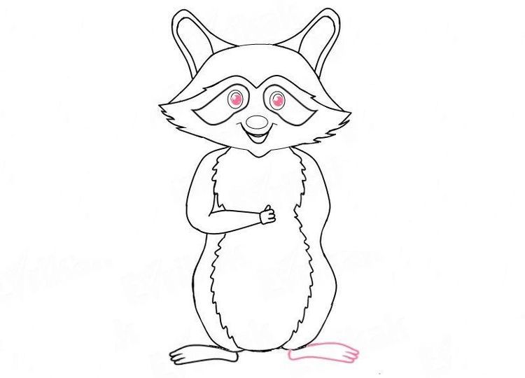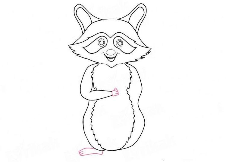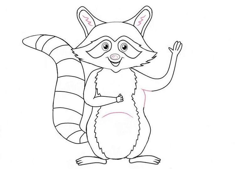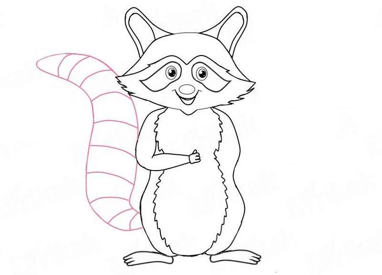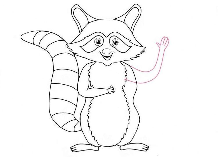 - La queue du raton laveur est aussi longue et touffue que celle d'un écureuil. Son principal ornement est son pelage coloré. La dernière étape consiste à dessiner la patte droite, levée vers le haut dans un geste amical.