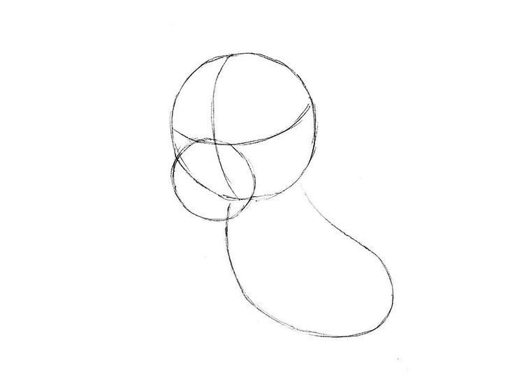 - Dessinez le corps à côté de la tête, en le représentant par un ovale légèrement incurvé. Notez que l'ovale est légèrement plus étroit en haut et plus large en bas. Tracez un cercle plus petit près des quadrants inférieurs de la tête. Il servira de base au museau.
