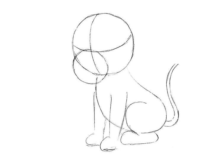 - Commencez par dessiner la tête de l'animal en haut de la feuille, près du centre. Elle est circulaire. Pour conserver la symétrie, divisez le cercle en quatre parties égales à l'aide de deux lignes perpendiculaires. Le lionceau étant positionné en biais, courbez ces lignes et décalez-les légèrement vers la gauche.