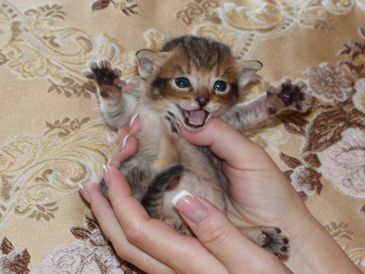Les chatons peuvent cracher dès la naissance et le font plus souvent que les chats domestiques. Ce crachage est totalement inoffensif ; les chatons cherchent à montrer leur force et leur courage en tremblant comme des feuilles de tremble. Durant cette période de méfiance, les nouveaux propriétaires doivent éviter les mouvements brusques et les bruits.
