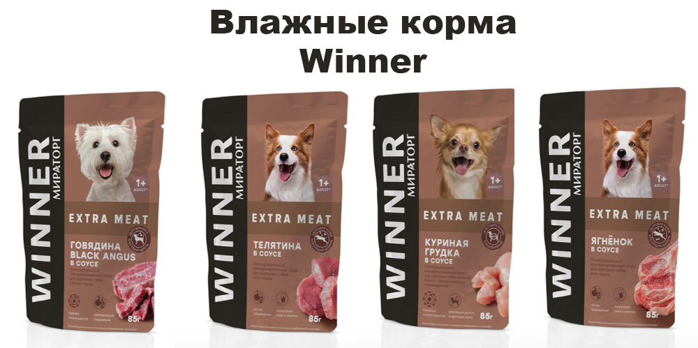 La gamme d'aliments humides pour chiens de Winner reçoit également des avis positifs. Miratorg propose plusieurs saveurs d'aliments humides Winner Extra Meat dans des contenants pratiques de 85 grammes.