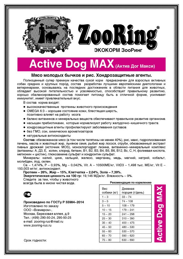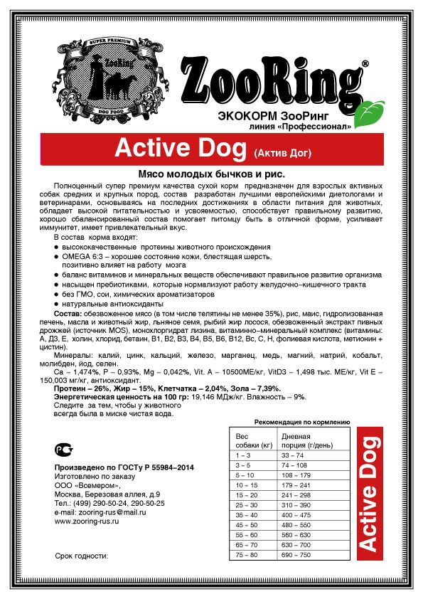 Pour connaître la composition exacte des aliments Zooring, il est préférable de consulter la liste des ingrédients du menu Active Dog au saumon et au riz de la gamme professionnelle. Cette alimentation de qualité supérieure est la plus polyvalente et convient à la plupart des animaux de compagnie au quotidien. Voici la liste des ingrédients :