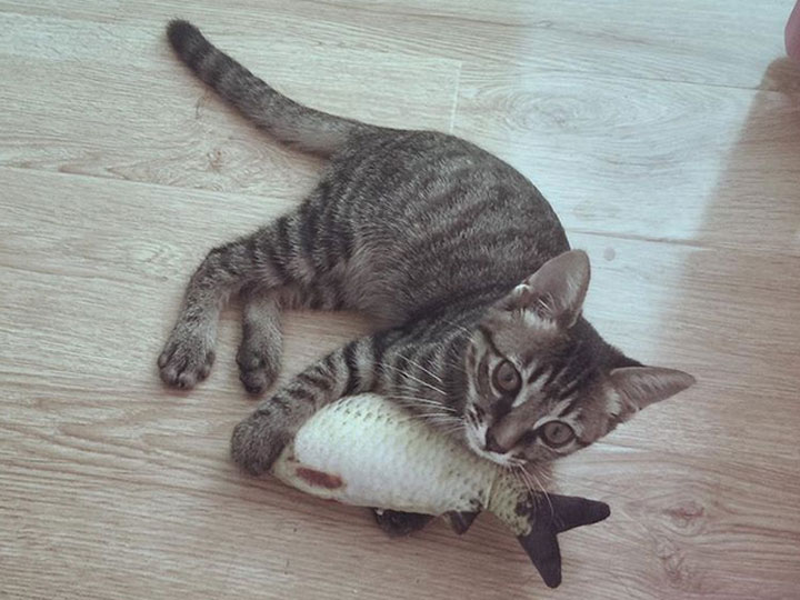Ma chatte ressemble beaucoup à un dragon chinois. Chaton, elle avait l'allure d'une chatte de race celtique, mais elle adorait jouer dans l'eau. Elle n'aime pas être portée, sa queue est plus longue que la normale et elle avait de petits touffes de poils sur les oreilles, qui ont disparu vers l'âge de six mois. Dès son plus jeune âge, elle grognait, mordait jusqu'à faire couler le sang à travers les vêtements et courait à toute vitesse, comme un ouragan. Elle marchait au bord du canapé, comme si elle était au bord d'une falaise. Si on l'éloignait un peu, elle sautait aussitôt dessus. Elle adorait s'installer dans le coin du canapé et de la table, où il y avait des falaises à droite, à gauche et droit devant. Elle avait de longues griffes noires et très acérées. À sept mois, elle a commencé à réclamer le chat très fort, et j'ai dû la faire stériliser. Après la stérilisation, ses griffes ont été raccourcies, mais elles ont rapidement commencé à tomber une à une, et à leur place, des griffes transparentes ont poussé, pas très longues, mais acérées.