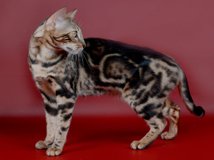 U chats du Bengale Il existe aussi des couleurs tabby particulières qu'ils ont héritées de leurs ancêtres sauvages : la rosette et le marbre – un marbre très contrasté avec une large rayure sur le dos.