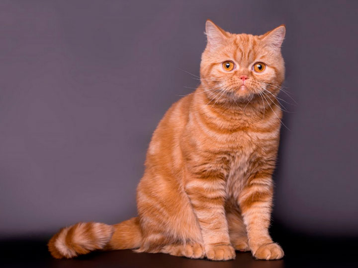 Outre le marbre noir classique et sa variante argentée déjà présentés, le British Shorthair existe aussi en version « marbre sur or ». Ce chat arbore une robe cuivrée dorée, rehaussée par des rayures noires ou brun foncé.