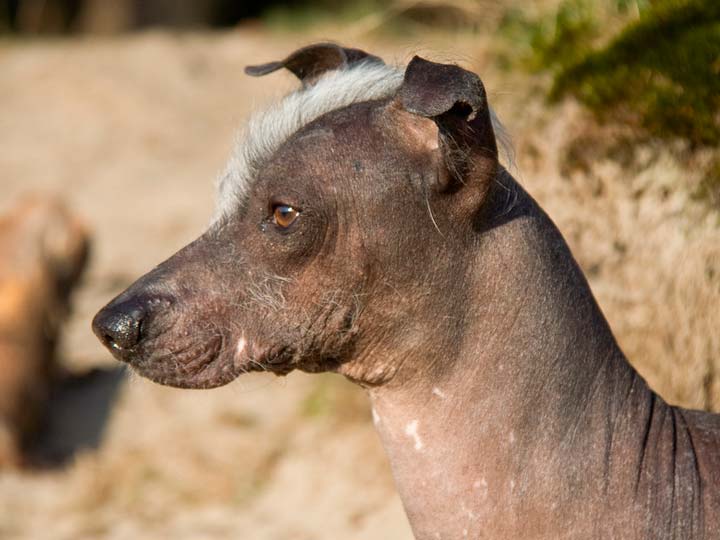 La tête est lupine. Le crâne est large et s'affine vers le nez. Les lignes du museau et du front sont parallèles. Le stop est peu marqué. Le museau présente un chanfrein droit, bien pigmenté d'une couleur harmonieuse avec celle de la peau ou du pelage. Les lèvres sont bien jointives. Les mâchoires ne sont pas très développées. Les chiens nus ont toujours une dentition incomplète. Les incisives s'articulent en ciseaux. Chez les chiens à poil, la dentition est complète, les dents sont normalement développées et l'occlusion est en ciseaux. Les yeux sont de taille moyenne, en amande, et leur couleur varie du noir au jaune. Les oreilles sont dressées lorsque le chien est alerte et couchées au repos. Elles sont de longueur moyenne, larges à la base et s'affinent progressivement jusqu'à une pointe. Dressées, les axes des oreilles forment un angle de 50 à 90°.
