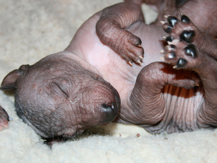 - Nu. La couleur de la peau varie du noir au blanc, en passant par toutes les nuances de gris, de gris-bleu et de brun foncé. Le pelage peut être uni ou présenter de légères marques sur n'importe quelle partie du corps, pourvu qu'elles ne couvrent pas plus d'un tiers du pelage. Les couleurs unies sont préférées. Quelques poils subsistent sur la tête, le bas des pattes et la queue ; quelques poils épars sur le dos sont admis.