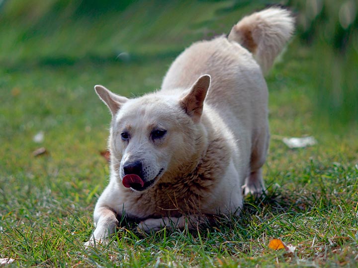 La tête est proportionnée au corps, le museau s'affinant légèrement vers l'extrémité. Les oreilles sont pointues (repliées vers l'avant chez le chiot, puis s'égalisant avec l'âge). Les yeux sont en amande, souvent bruns. La dentition est complète, avec un articulé en ciseaux régulier. Les lèvres noires forment le « sourire » caractéristique de nombreuses races asiatiques, visible sur la photo. Les mâles ont une tête sensiblement plus grosse. Le corps est robuste. La queue, enroulée sur le dos, est touffue. Les pattes sont très fortes, avec une musculature bien développée.