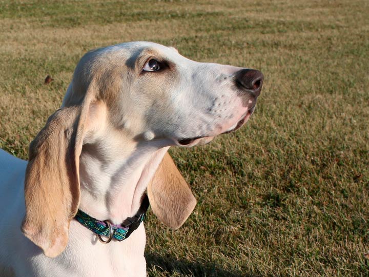 La tête est sèche et ciselée. Le crâne est large entre les oreilles et arrondi. Le stop est modéré. Le museau est long, le chanfrein est droit ou légèrement bombé. La truffe est développée et noire. La lèvre supérieure recouvre légèrement la lèvre inférieure, sans être tombante. Les muqueuses sont noires. Les yeux sont foncés et de taille moyenne. Les oreilles sont longues, fines, recourbées vers l'intérieur et attachées sous la ligne des yeux. Le cou est long, un léger fanon est admis.