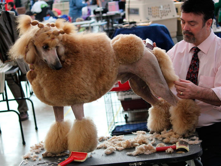 Il est intéressant de noter que les caniches, après plusieurs siècles de vie aux côtés des humains, se sont tellement habitués au toilettage qu'ils y prennent plaisir. Souvent, il n'est même pas nécessaire de les retenir sur la table du toiletteur. Leur pelage particulier n'est pas abîmé par les manipulations. De plus, sans brossage et coupe réguliers, il ne peut conserver son aspect attrayant et sain. Il n'est pas courant de couper les poils courts des caniches en hiver. Les chiens d'exposition, dont le pelage est nu, doivent porter des vêtements adaptés aux conditions climatiques.