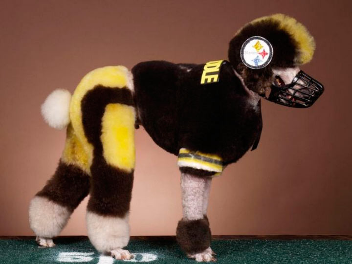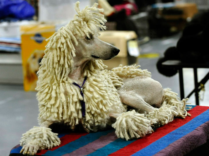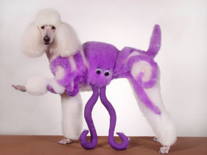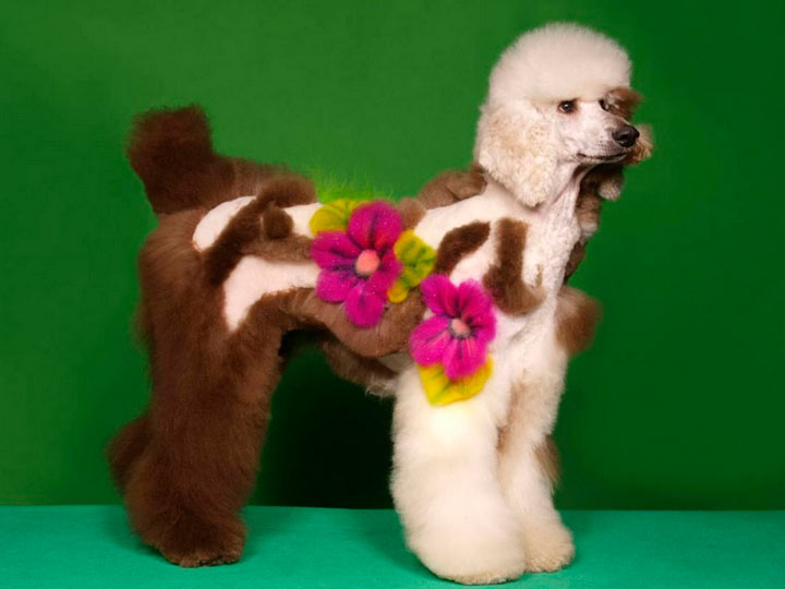 Les propriétaires de caniches blancs teignent parfois leur pelage. Aux États-Unis, il existe même des expositions de coupes de cheveux originales où les caniches excellent. Vous pouvez voir plusieurs photos de chiens aux coupes de cheveux créatives dans la galerie ci-dessous.