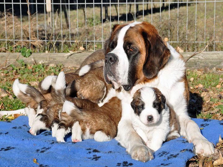 - Les jeunes chiots Saint-Bernard sont nourris six fois par jour. À cet âge, ils ont besoin de fromage blanc et de lait. Plus tard, il est préférable de les remplacer par des produits laitiers fermentés.