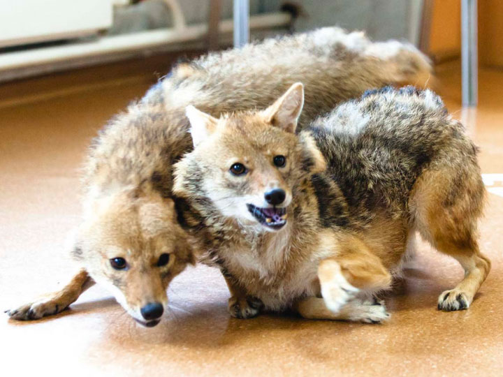 - Chacal commun Petit prédateur quasi omnivore, il ressemble au loup. Au garrot, il mesure 50 cm et pèse 10 kg. Son pelage, de couleur zonale selon son habitat, varie du noir profond au roux jaunâtre. Cette espèce est présente sur un vaste territoire, de l'Europe à l'Asie orientale. À l'état sauvage, les chacals sont assez audacieux et nocturnes. Monogames, ils choisissent un partenaire pour la vie. intelligent et agile.