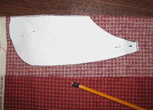 Nous prenons le tissu pour la future cape, nous le plions en deux et nous appliquons le patron le long du pli du bord supérieur afin d'obtenir au final une seule pièce, comme le montre la photo.