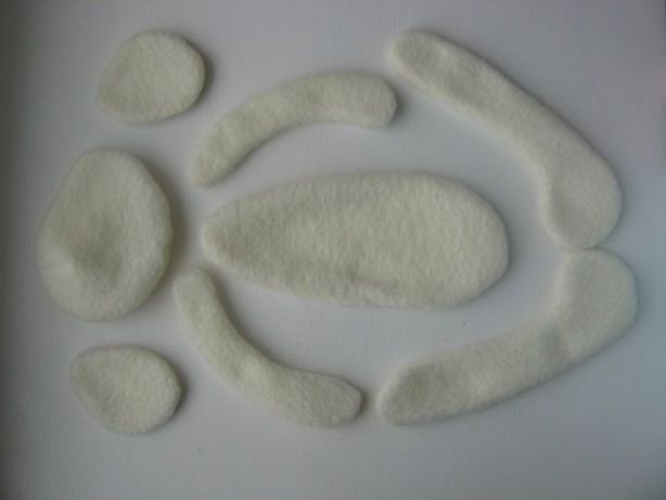 - 3 morceaux de tissu : uni (vous pouvez utiliser de la polaire) – pour le corps et 2 types de couleurs (pour la robe) ;