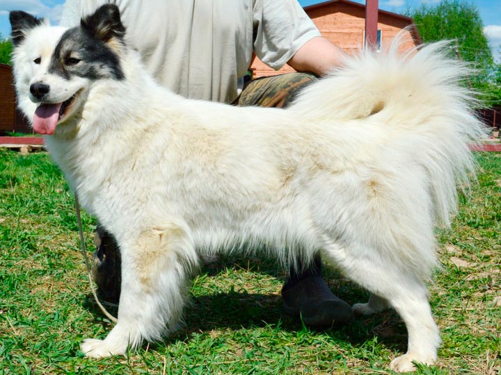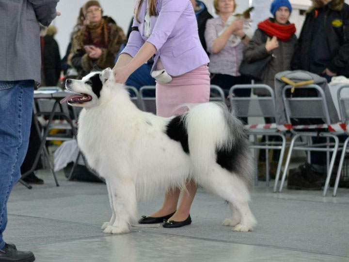 Le pelage est très épais, droit et brillant. Il est rêche au toucher. Les poils sont de longueur moyenne, environ 10 cm. Le sous-poil est dense et bien fourni. Les poils du cou forment une crinière, l'arrière des pattes est densément frangé et la queue présente une légère frange. Les poils sont plus courts sur le museau, la tête et le devant des pattes. La robe est blanche, tachetée, bicolore ou tricolore.